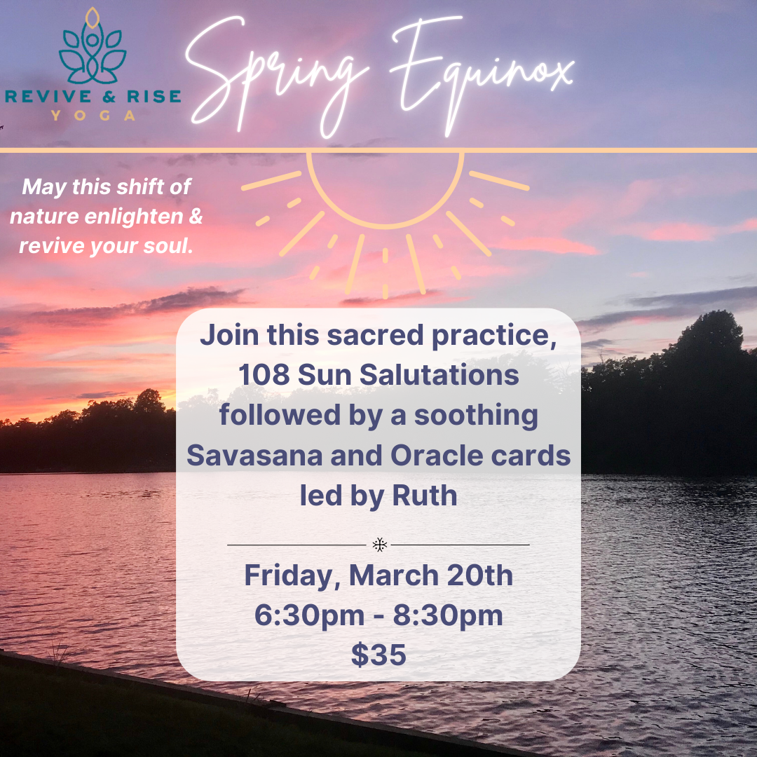 The spring equinox represents a time for rebirth and new beginnings! We will begin by creating a moving meditation with 108 sun salutations! This powerful meditation will allow you to dive deeper within and detox the mind, body, spirit! This isn’t your traditional mala practice… you will be guided in a functional warm up that supports your body and will be given alternative variations that you can choose from throughout YOUR 108!